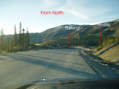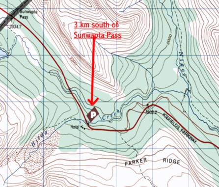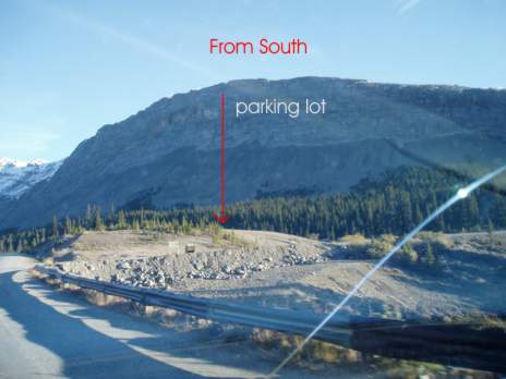 The parking lot is 3.1km south of the Banff Park Boundary. You will drive past this on your way south from the icefields. If coming up from the south, the parking lot is on the right side of the road, about 1km north of the Parkers Ridge area. The accompanying map and pictures should help get you there.